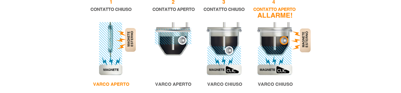 La tecnologia Magnasphere® dei contatti CLIC, anche nelle più piccole versioni da incasso, offre prestazioni ad alta sicurezza confrontabili con quelle ottenute da contatti a triplo bilanciamento magnetico.