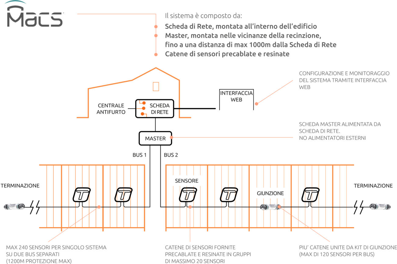Sfruttando la tecnologia MEMS e grazie ad un sofisticato algoritmo proprietario, Macs è in grado di rilevare qualsiasi tentativo di scavalcamento, garantendo al tempo stesso elevata immunità nei confronti di eventi climatici avversi. Ad esempio pioggia, vento, presenza di vegetazione, strade, ferrovie o macchinari situati nelle vicinanze della recinzione e azioni umane non assimilabili allo scavalcamento.